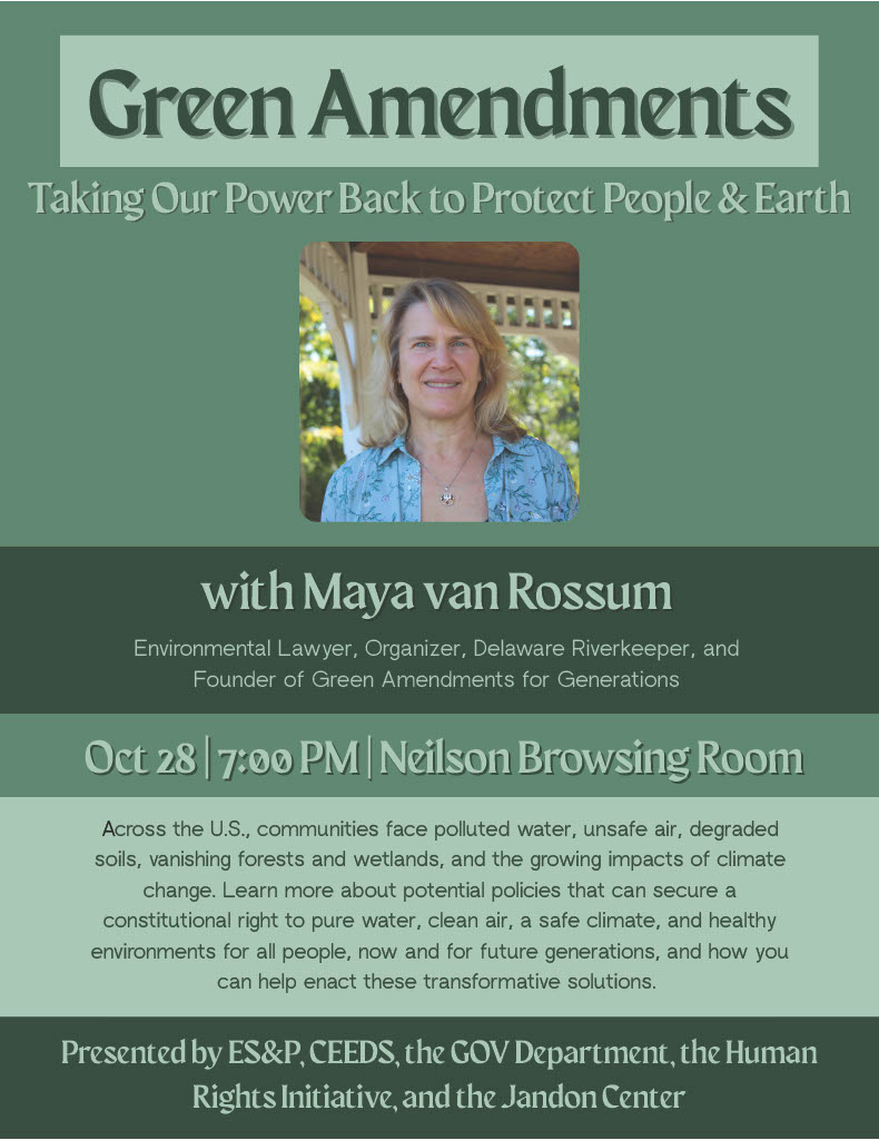 Join Maya van Rossum for a discussion on Green Amendments’ power in modern environmental activism for environmental justice and climate action, and how Smith College students and members of the public can get involved with the movement. You’re sure to leave feeling inspired, empowered, and ready to take action for environmental rights!