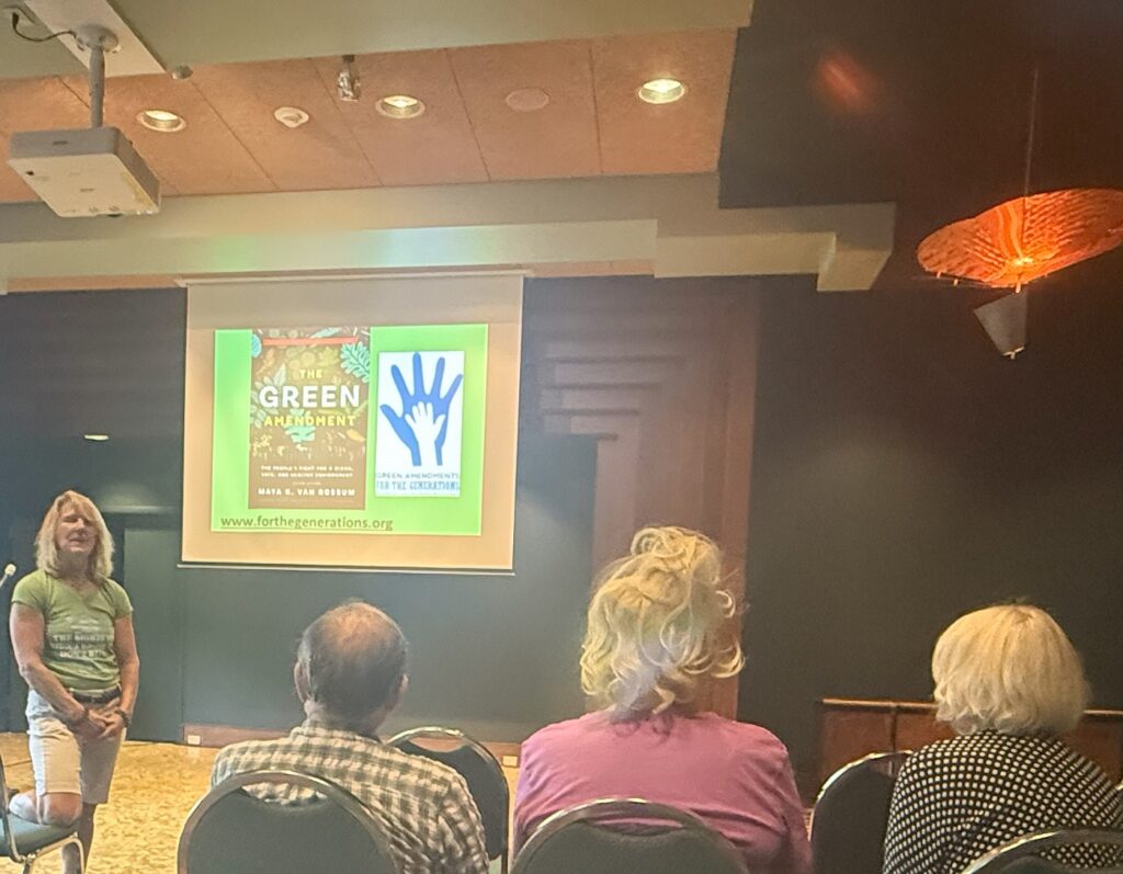 Thank you, Maya, for coming to Seattle and giving such a dynamic talk! Yesterday I sent an email to my two state representatives and my state senator about promoting and passing the Washington State Green Amendment. I will follow up with calls.